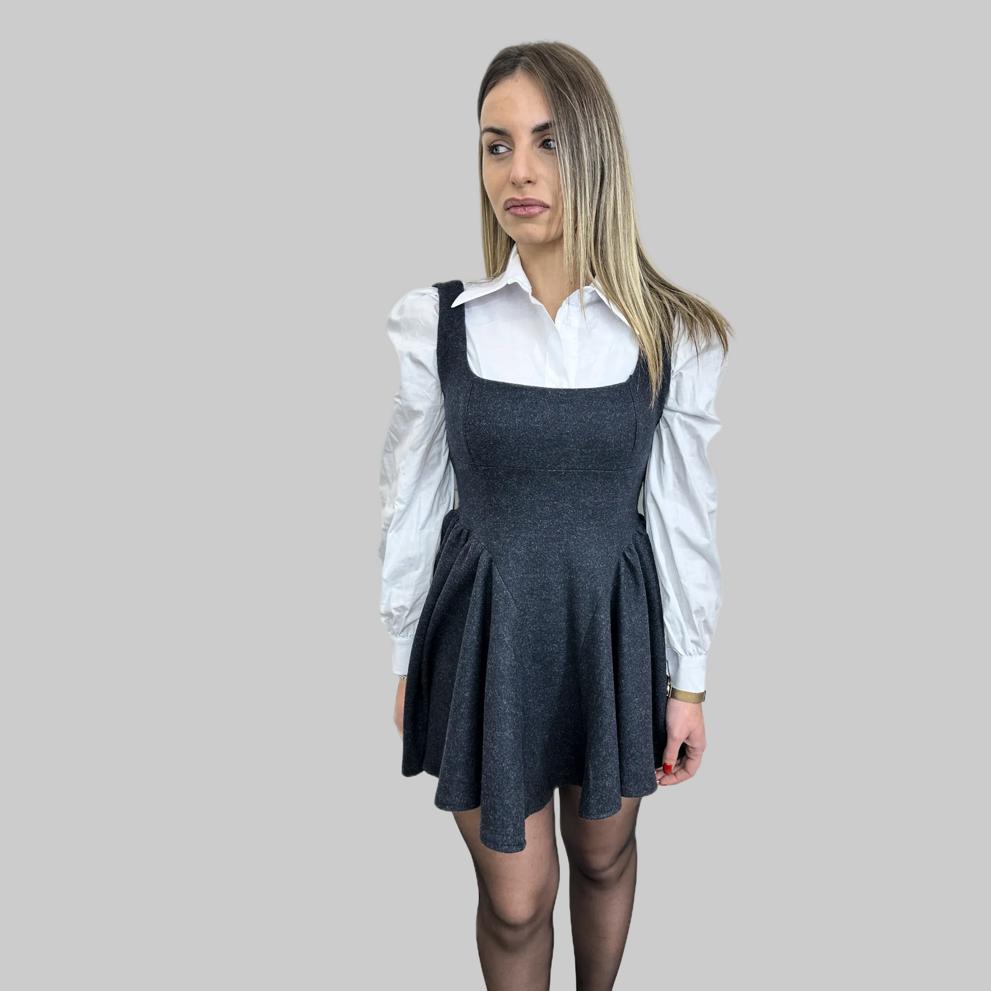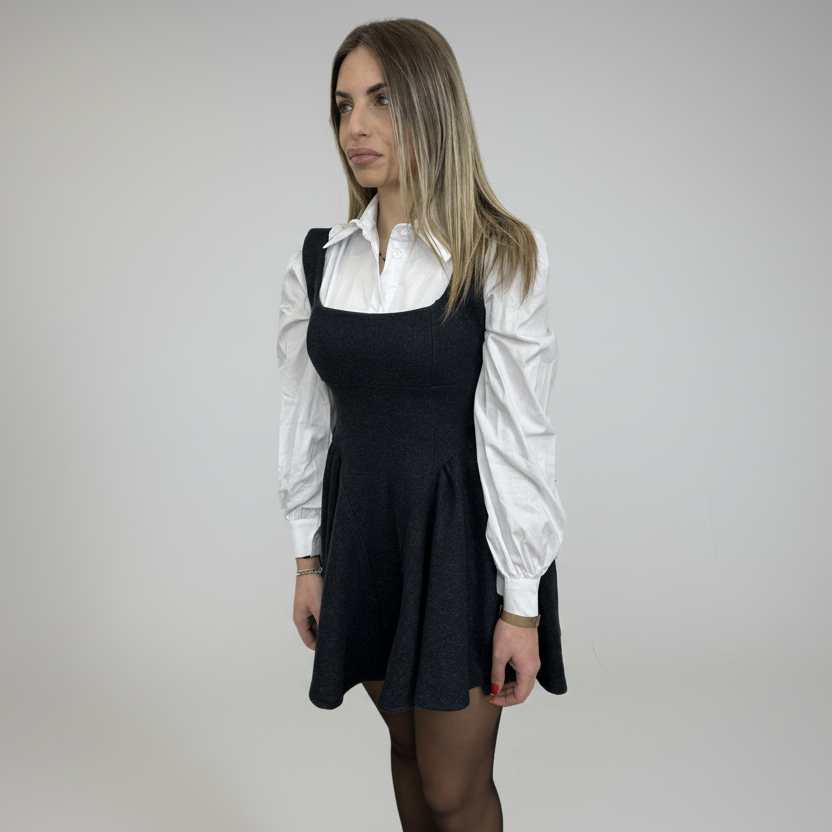 Puoi anche indossare i pezzi separatamente per creare outfit diversi: la camicia con maniche a sbuffo si abbina perfettamente a jeans o gonne, mentre l'abito con spalline può essere indossato da solo o sopra altre camicie per look sempre nuovi.