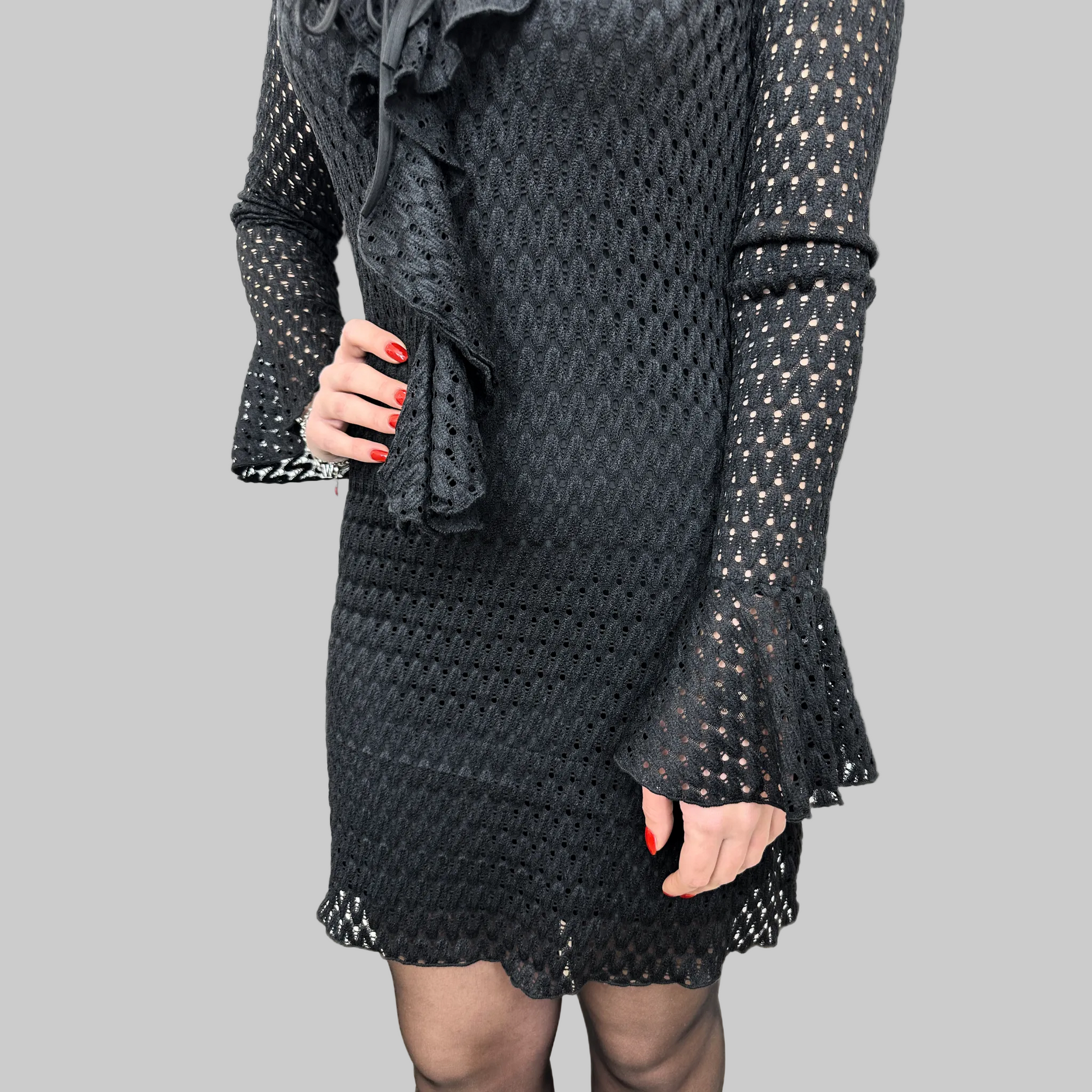 Abito mini traforato è la scelta perfetta per chi cerca un look romantico e raffinato. I dettagli in pizzo traforato e i volant delicati creano un insieme armonioso che valorizza la silhouette con eleganza.