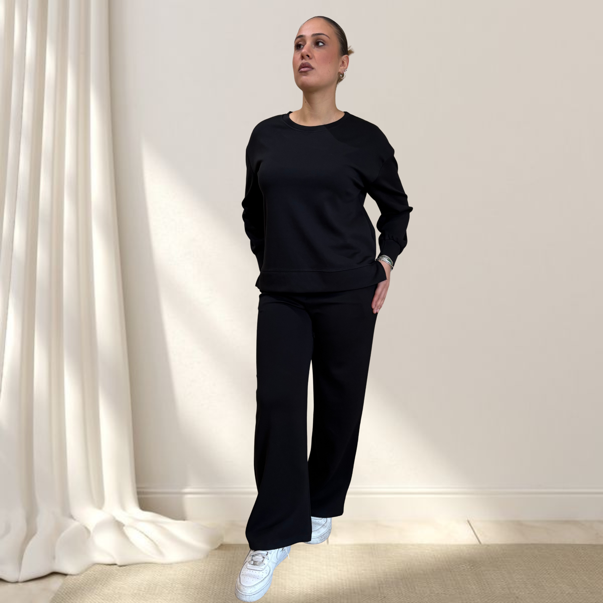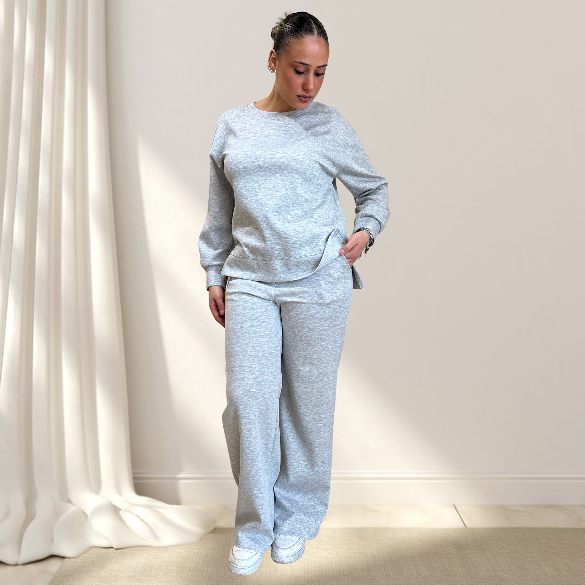 Indossa il set completo con sneakers bianche per un look athleisure totale, oppure separa i pezzi: felpa con jeans o pantaloni con crop top. Perfetto per palestra, commissioni quotidiane, viaggi o weekend relax con stile effortless.