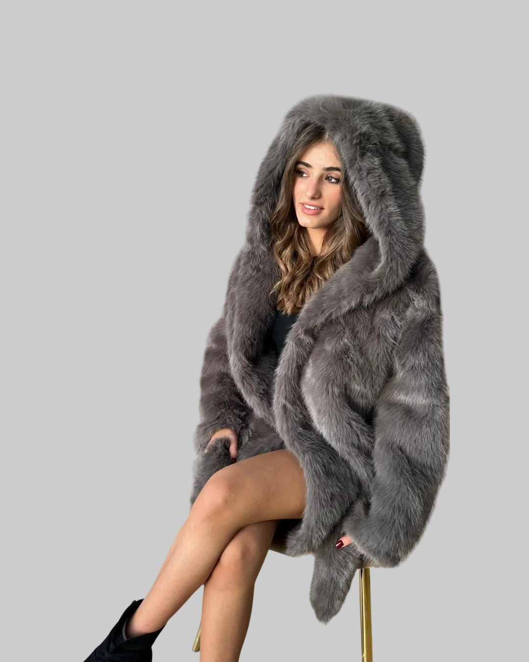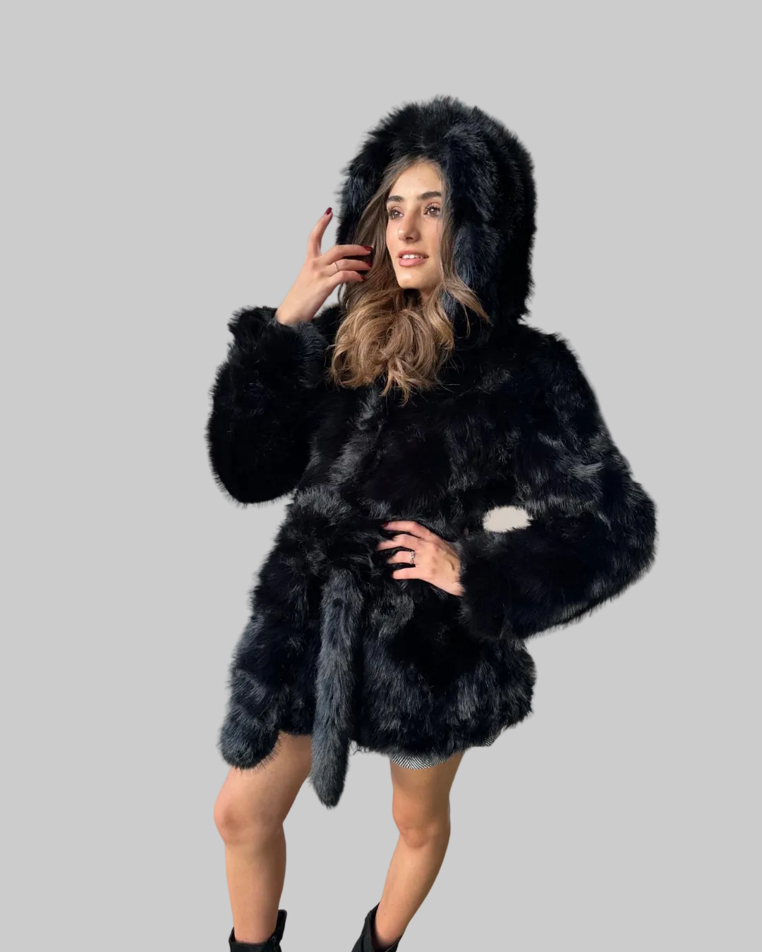La pelliccia ecologica morbida e la cintura in vita creano una silhouette definita e glamour, ideale per chi ama le pellicce ecologiche eleganti che uniscono stile sofisticato e scelta cruelty-free responsabile.