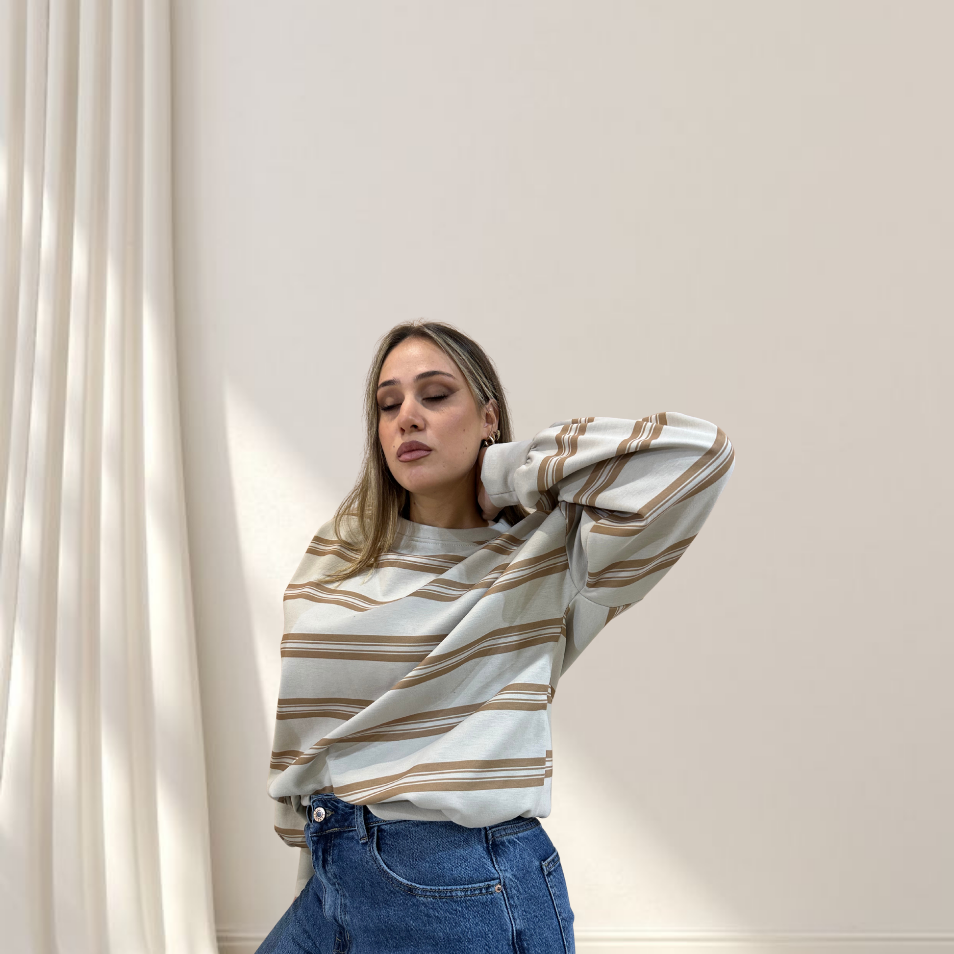 Felpa a righe è la scelta perfetta per chi cerca un look casual-chic e confortevole. Il motivo a righe aggiunge movimento e carattere, mentre il tessuto morbido garantisce comfort durante tutta la giornata.