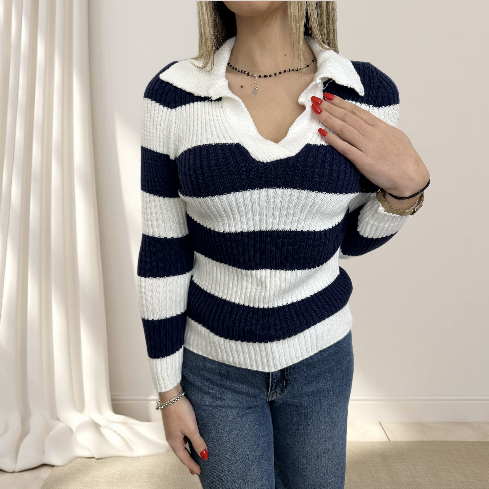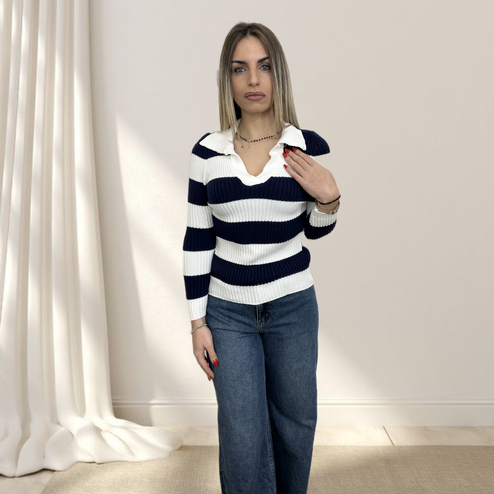 Maglioncino a strisce con scollo a V è il perfetto equilibrio tra stile raffinato e comfort quotidiano. Le righe dinamiche aggiungono movimento e carattere, mentre lo scollo a V con colletto dona un tocco di eleganza sofisticata.