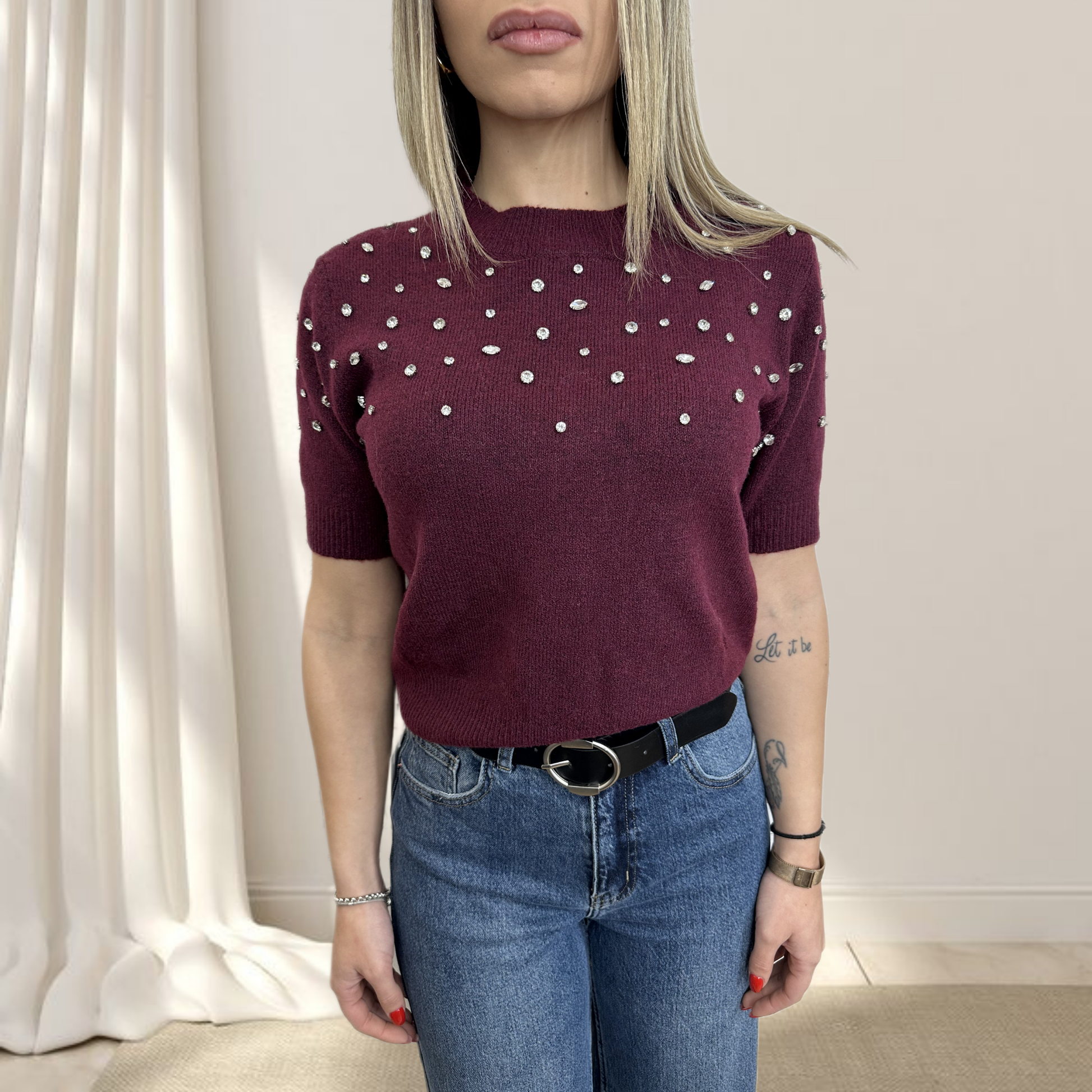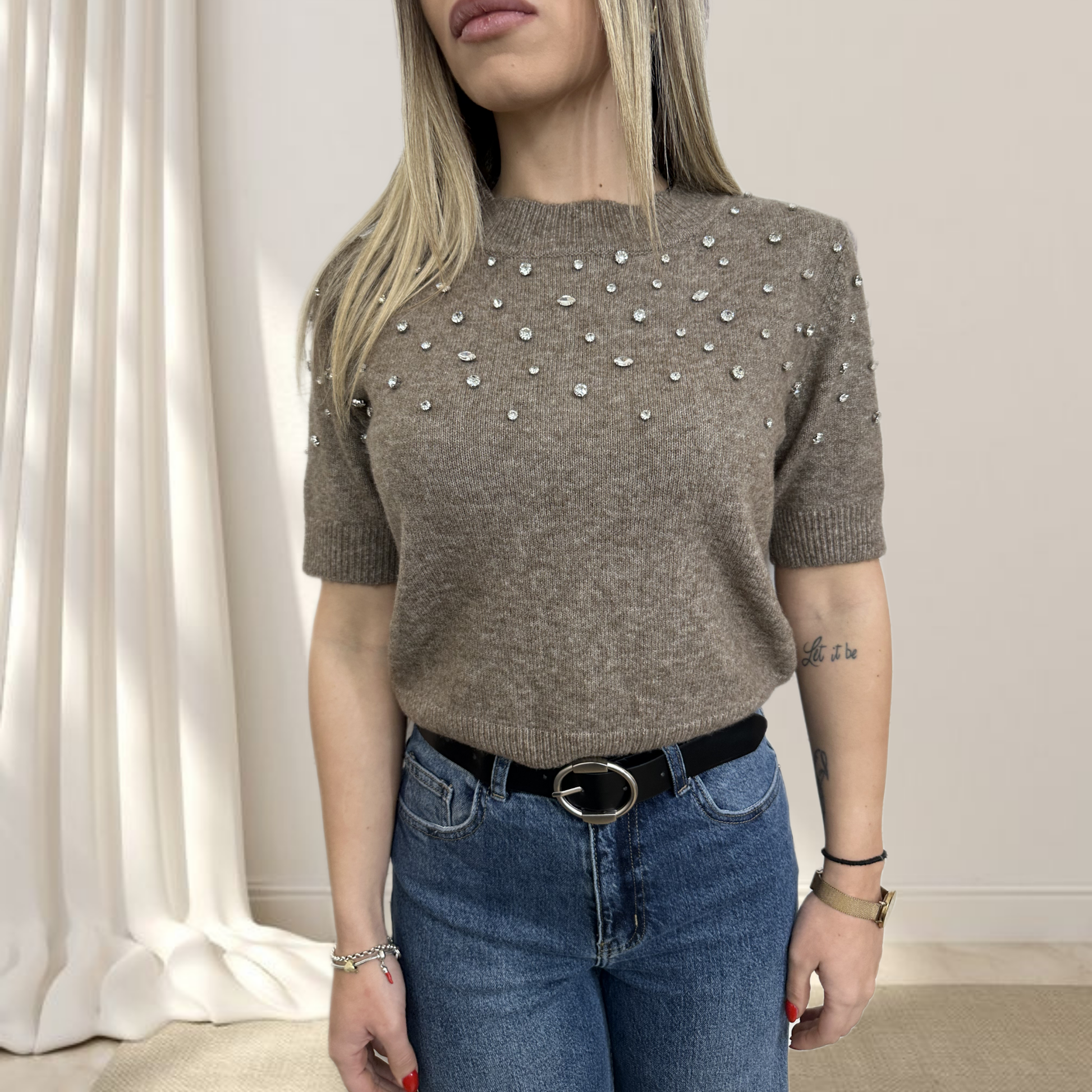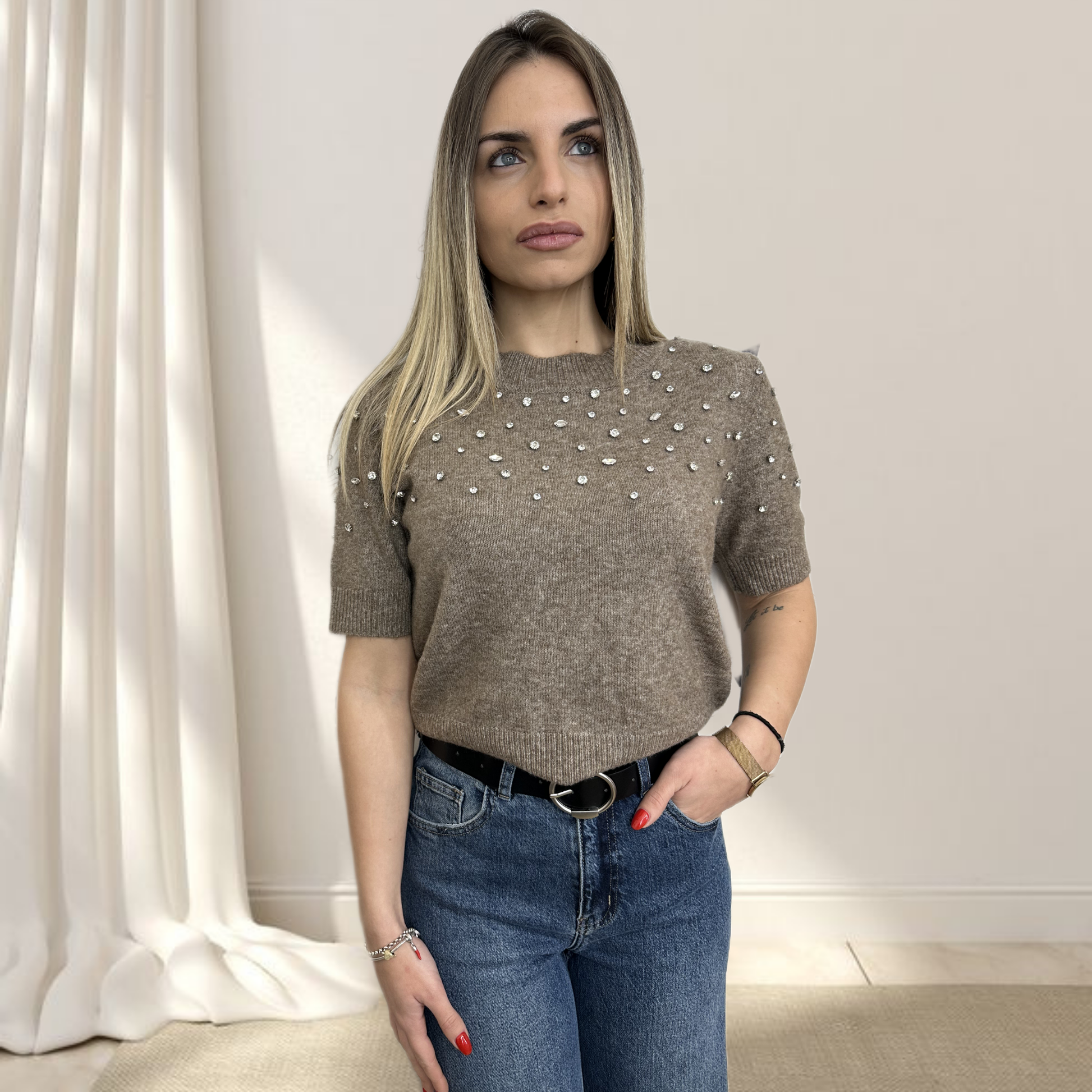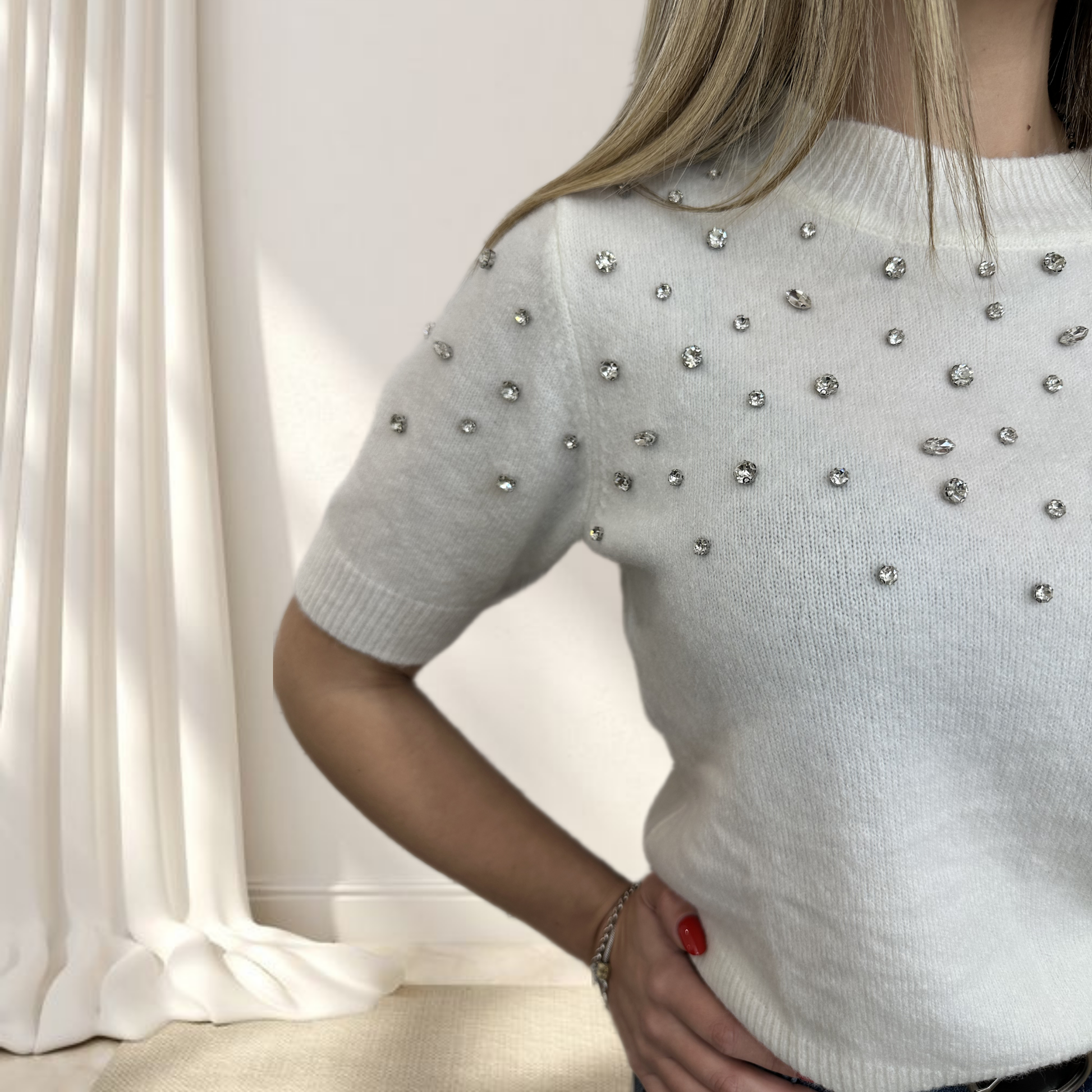 Maglioncino a mezze maniche è un capo speciale che unisce raffinatezza e stile contemporaneo. Le piccole perle applicate sulla parte superiore creano un effetto luminoso e prezioso, trasformando un semplice maglioncino in un pezzo elegante e sofisticato.