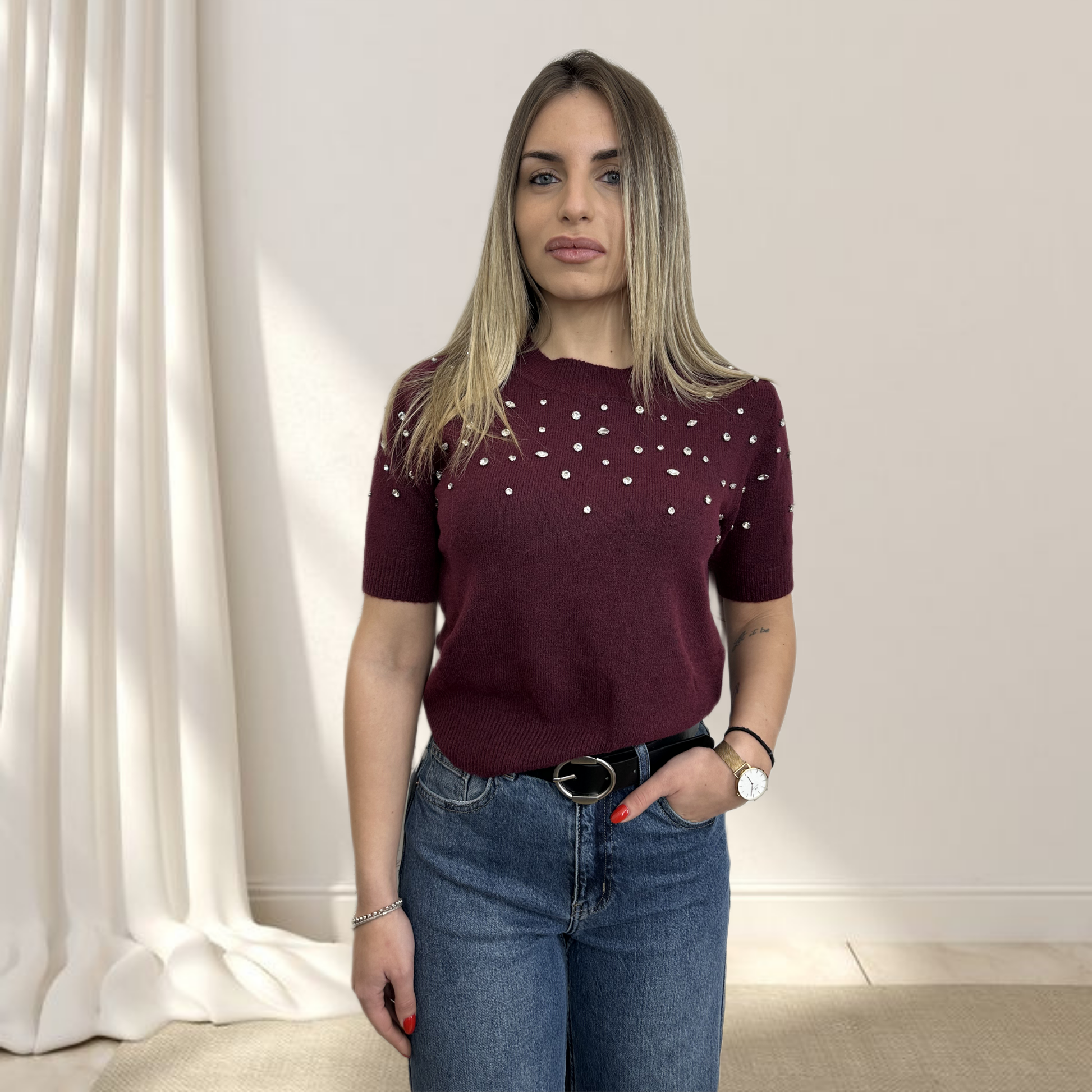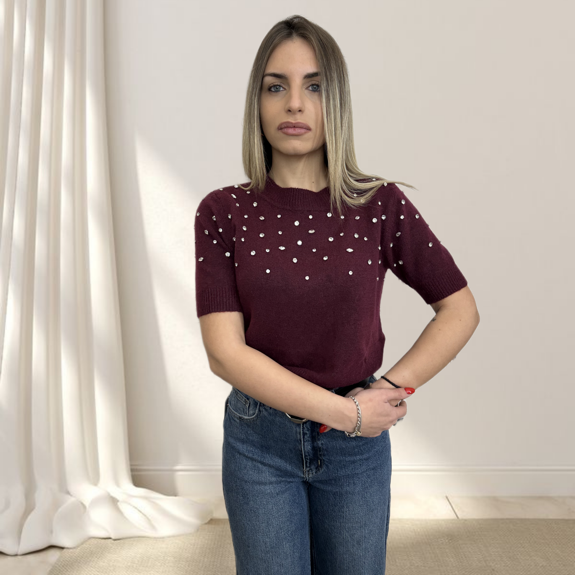 Un maglioncino prezioso che unisce eleganza, sostenibilità e dettagli luminosi!