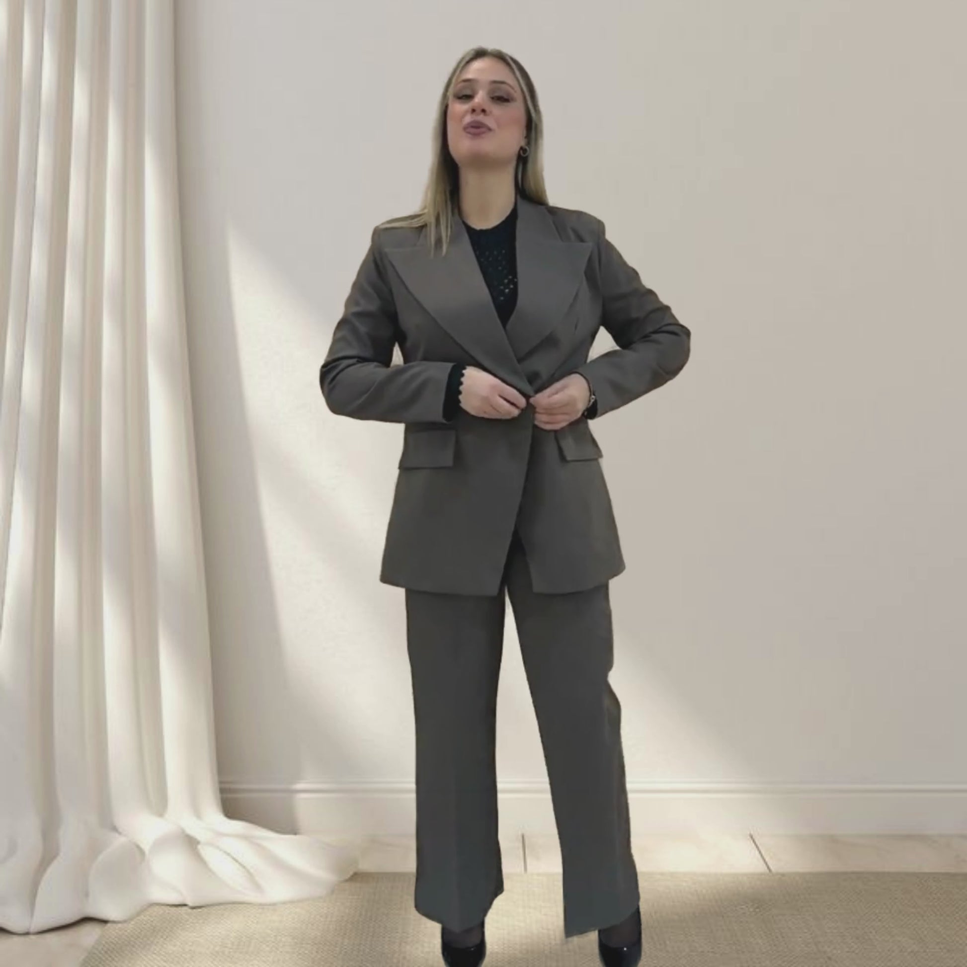• Sciarpa Integrata: Dettaglio unico che distingue questo tailleur e aggiunge carattere