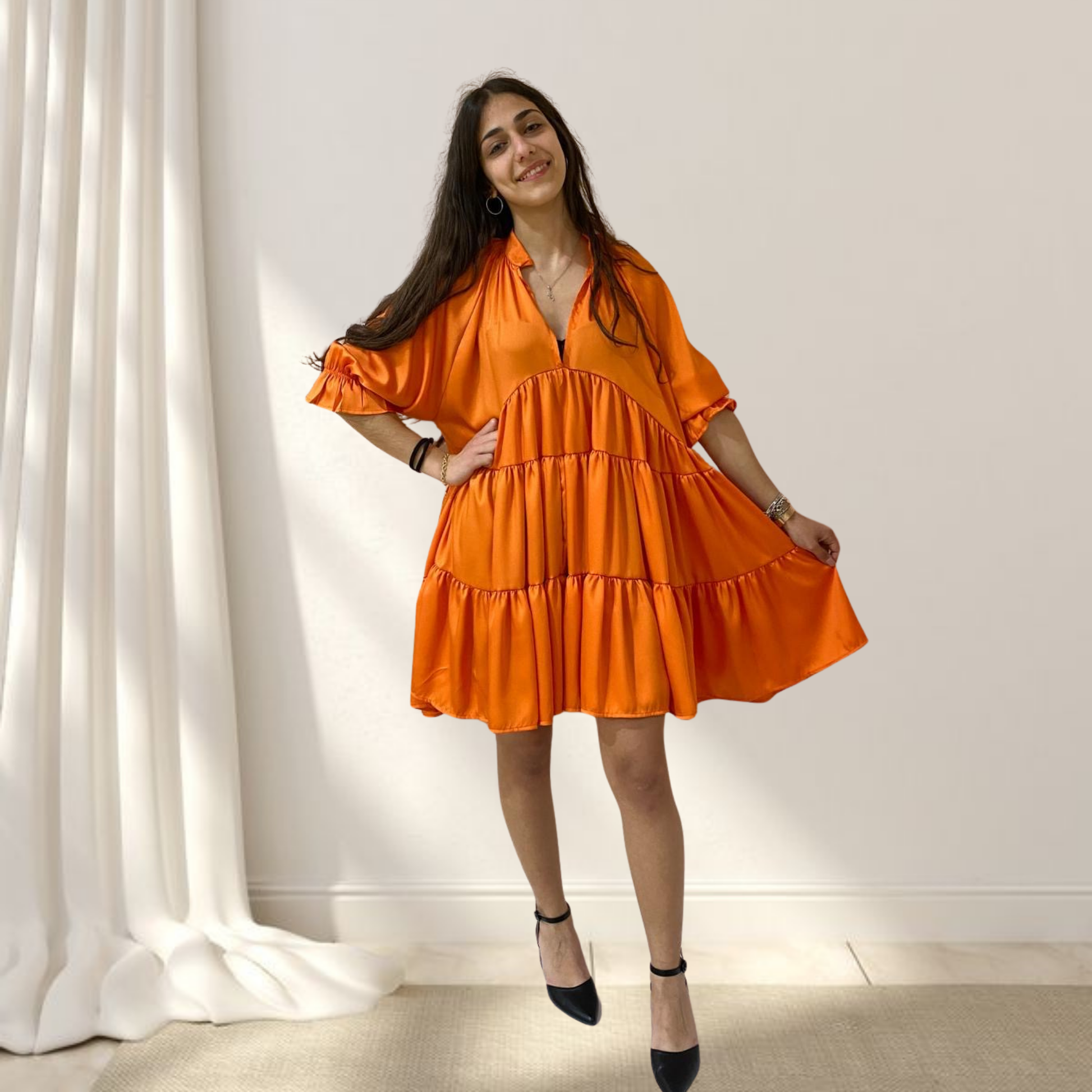 Vestito corto a balze Lumina perfetto per chi cerca un look fresco, romantico e pieno di movimento. Il colore arancione vivace e la silhouette ampia e leggera lo rendono ideale per le giornate calde e le occasioni estive.