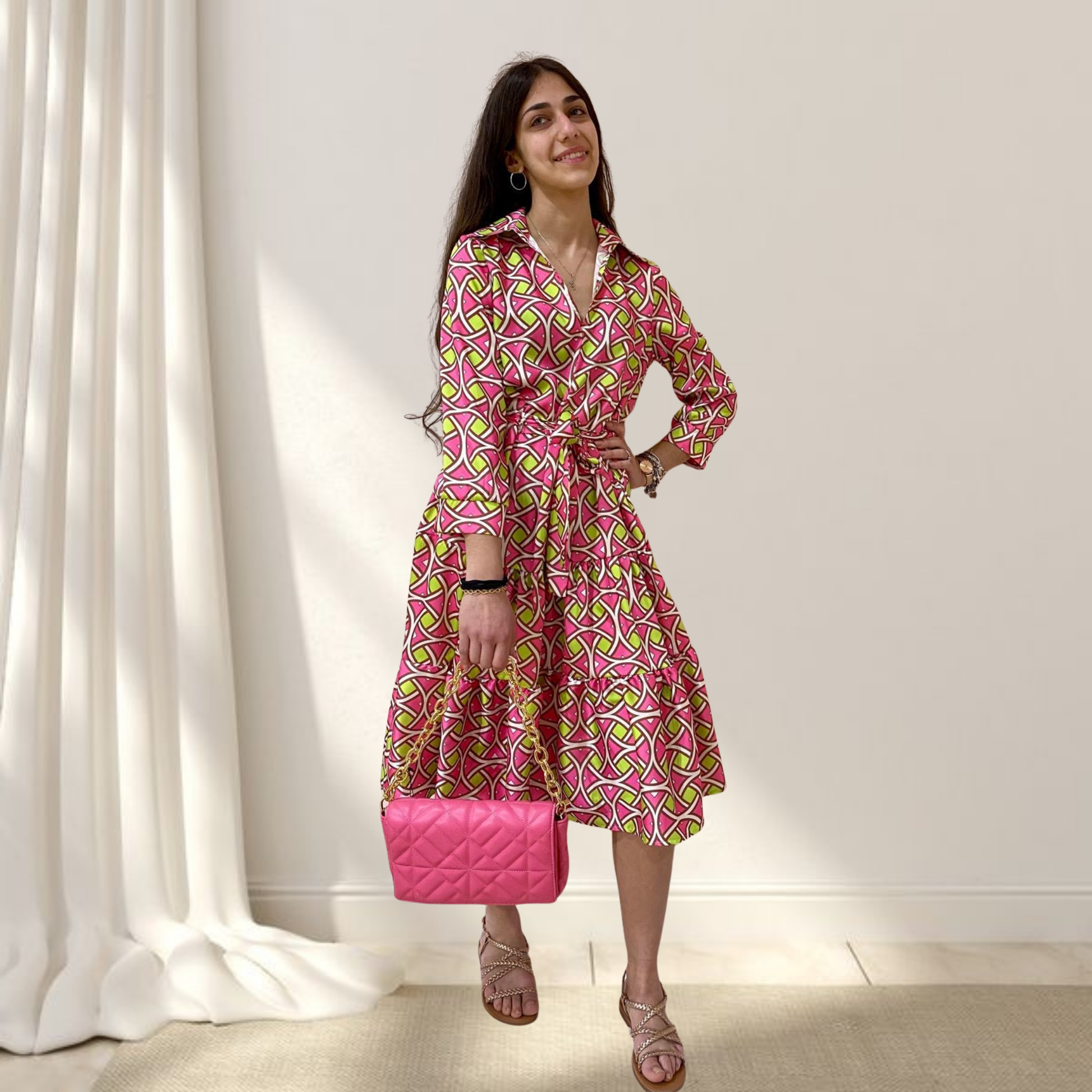 Il Vestito midi è un capolavoro di design contemporaneo che unisce eleganza e modernità. Caratterizzato da un affascinante motivo geometrico nei toni del rosa e verde, questo abito è perfetto per chi ama distinguersi con classe e personalità.